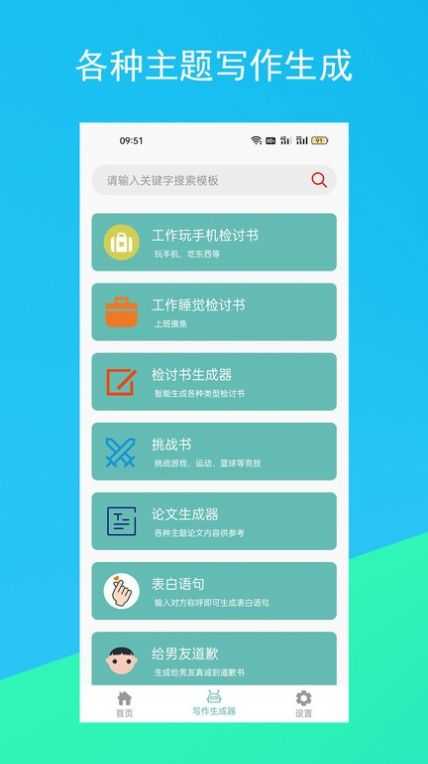 ·各种主题的写作内容都会帮助你智能的生成,只需要输入关键字即可查找相应的写作模板。