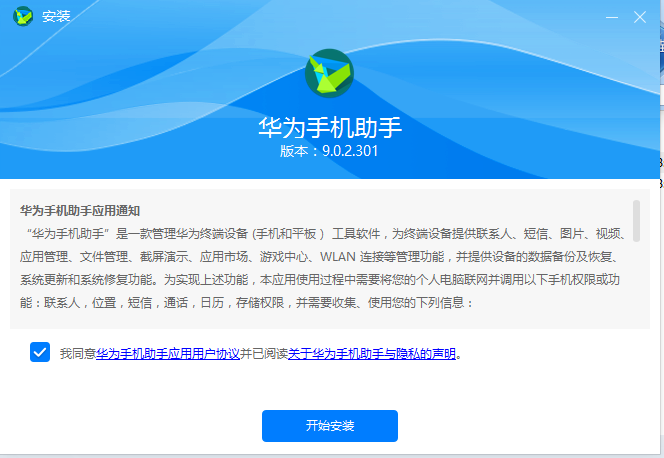1、在本站下载华为手机助手后,在电脑本地得到一个压缩包,使用360压缩软件解压后,双击.exe文件进入华为手机助手安装界面,点击【开始安装】。