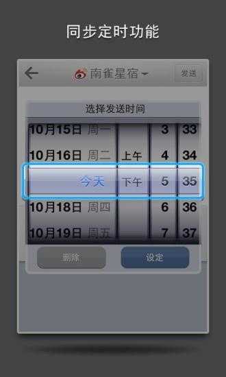 可随时随地设置定时发送功能,支持新浪、腾讯同步发布,并自定义来源信息。