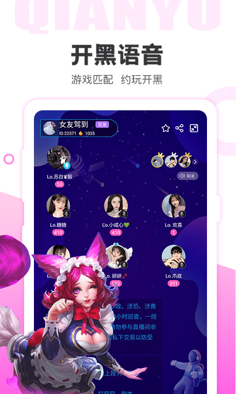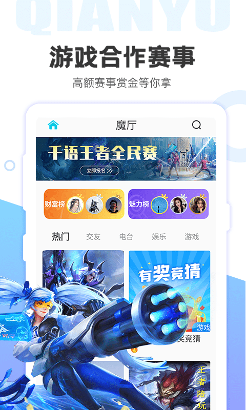 千语空间安卓版是一款年轻人都在用的社交聊天软件,千语空间安卓版中汇集了海量优质的单身男女,语音连麦、游戏开黑等超有趣的互动玩法,增进大家的距离,让你大家可以零距离接触,还在等什么,赶快来下载千语空间安卓版吧!