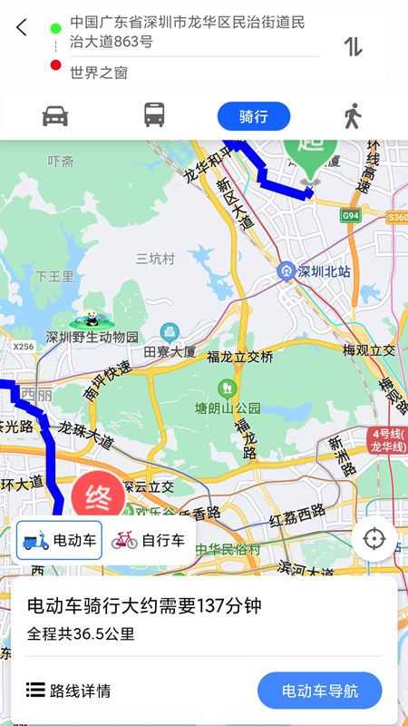 1、交通方式多,线路查询页面中提供驾车、公交车以及电动车和自行车骑行导航多种方式。