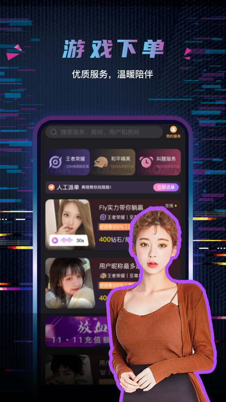 玩偶开黑是一款最近非常火热的陪玩app,在这个平台上面认证了海量的陪玩大神,并且提供了相当丰富的陪玩玩法,具备了聊天室,语音房,开黑私聊等等全面的功能,上分找陪玩大神,孤单无聊找颜值女神,无时无刻不带给您暖心的陪伴,有兴趣的朋友现在就来下载使用吧!