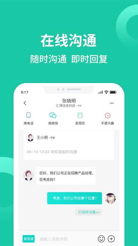 2、职位信息透明,用户可直接与招聘方在线沟通,深入了解岗位要求,更快锁定目标。