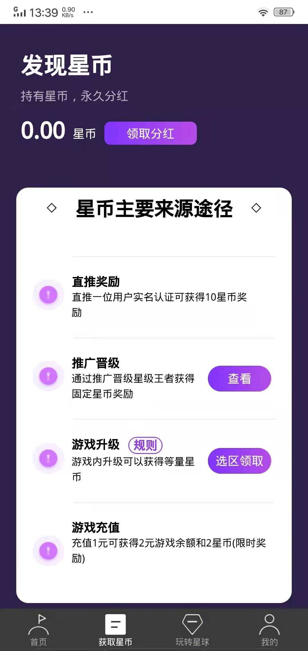 2、积极参与平台推出的多款新游戏,通过升级不断积累星币,享受每日分红权益