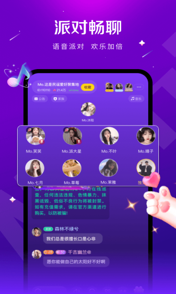 超热闹语音派对,多人在线嗨聊,跳脱传统交友方式,甜蜜互动陪伴你24小时畅聊不孤单~