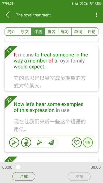2、在听力资源区,选择一篇感兴趣的新闻或短文,先完整听一遍,然后使用跟读功能模仿发音,并完成配套练习题。