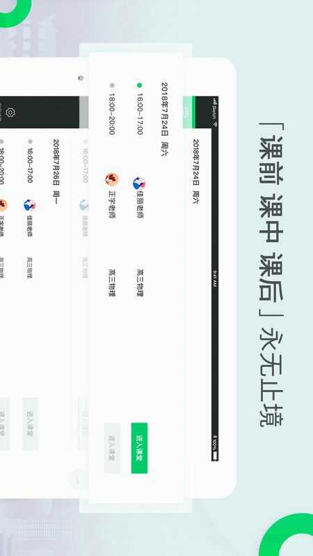 Pad端顶部展示白板/讲台/课件三个导航,上课过程同步老师的操作,学生也可自行切换;
