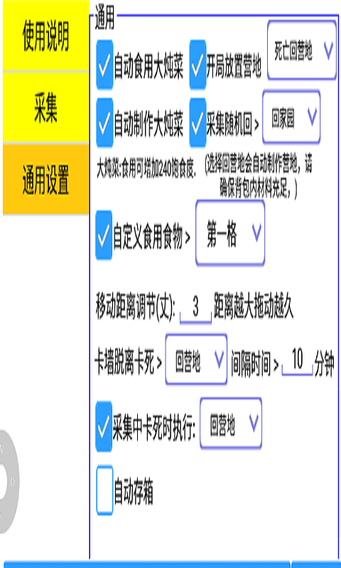 勾选自动存箱后,如果还勾选了采集随机回营地,就会在存箱完成后回到营地内开始采集。否则就会在家园内开始采集。