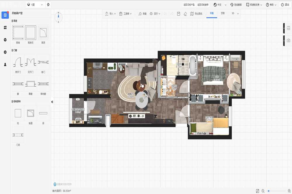 点击首页进入户型”进入户型设计界面,详见【画户型工具】图文教程 。完成户型图绘制后,点击右上角3D装修”,开始你的3D装修设计之旅。