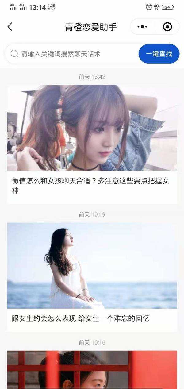 青橙恋爱助手app是一款专为广大直男们打造的恋爱助手软件,有了这款软件,就可以学会超多的恋爱技巧和恋爱话术,每日丰富的话术为你提供,手把手教你聊天,手把手教你撩妹,轻松帮你脱单,快来下载青橙恋爱助手app吧。