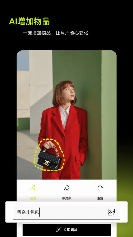物品添加与编辑功能:支持通过AI技术为图片一键增加物品,并提供橡皮擦、重置等工具,让用户可以根据需求调整添加的物品,优化图片效果。