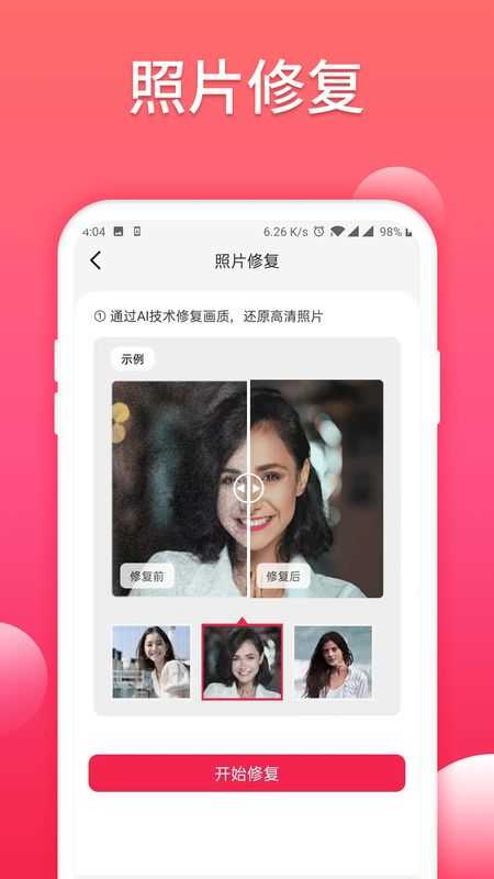 2、照片修复,通过扫描,用户可以一键修复照片,让照片能变得更加清晰。