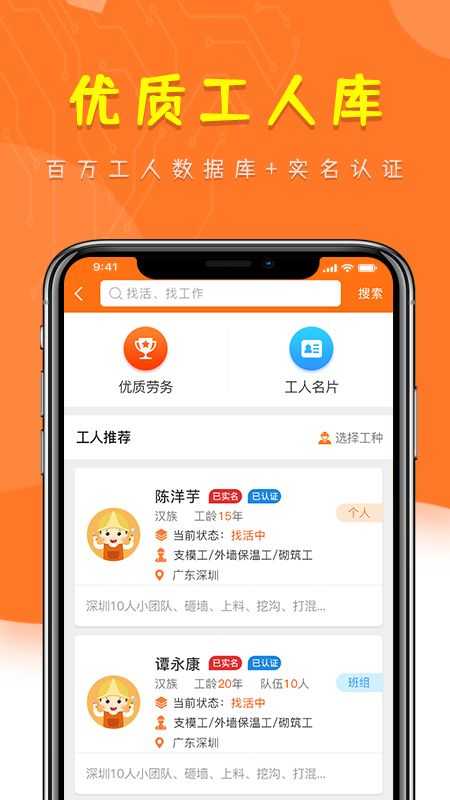 2、招工安全可靠性高,工友们都是用身份证进行认证的,可以用人完全没有后顾之忧。