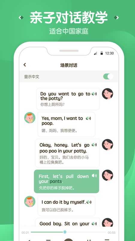 1、说了早安晚安就不会其他的句子?根据中国家庭的特点和语言习惯,覆盖 300+ 个亲子生活场景。