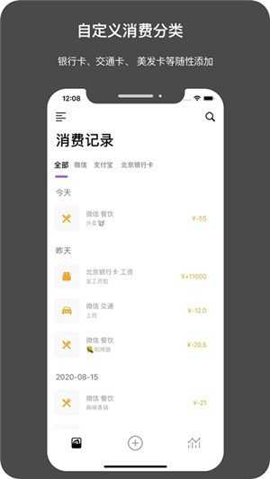 2.自定义分类:随意添加,支付宝,银行卡,任意分类,数据统计:时间,位置,图形,文字,金额,各种统计均可用;
