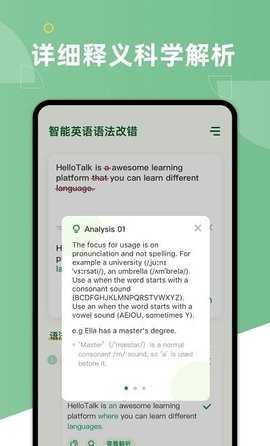 1、能够辅助用户进行英语语法上面的纠错,帮助用户更好的进行英语上面的学习;