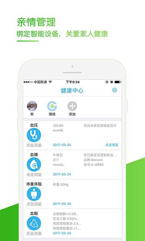 4.亲情管理:添加亲人信息, 为其测量血压/血糖等健康服务, 温暖关怀、关注亲人健康。