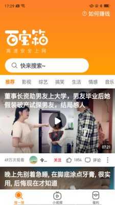 百宝箱浏览器这款软件和其他的不同,在这里用户们能利用这款软件赚钱,超强的搜索功能帮助小伙伴们想看什么就能搜索到什么,各种小视频,笑话,段子都能在这里看到,资源丰富、搜索便捷、安全无毒无广告,快来下载百宝箱浏览器吧