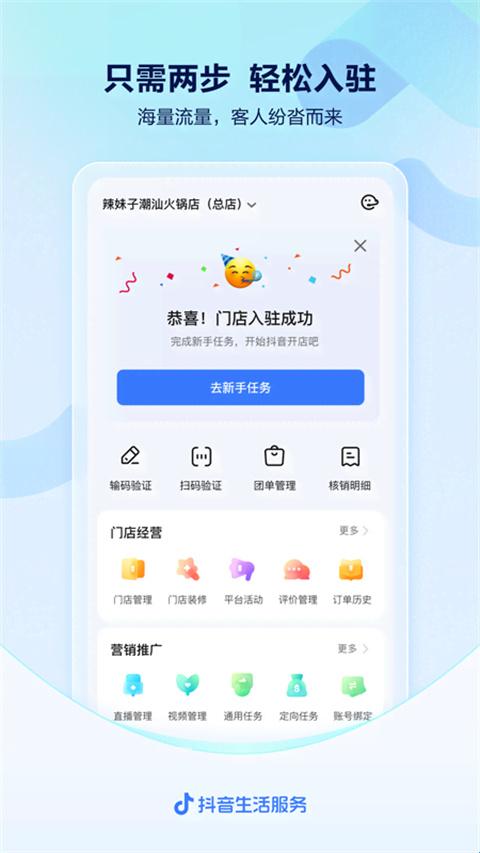 抖音来客是一款非常不错的本地商家入住的软件,这款软件是可以帮助用户线上注册开店的,软件上的功能非常强大,我们在这里不仅可以开店,而且还可以随时查询各种数据,这款软件可以满足用户的所有经营需求,抖音来客这款软件还可以提供了多种营销推广手段,凡是下载这款软件的用户都是可以随时推广自己的商品,这样才能拥有更多的浏览量,有需要的用户赶紧来下载这款好用的商家服务中心哦。