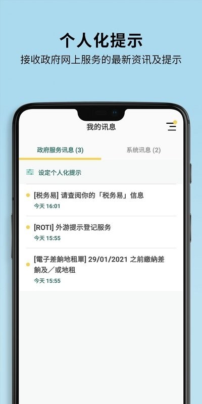 2265用户可选择接收政府不同网上服务的个人化提示,紧贴各项服务更新、到期提示及最新资讯等。
