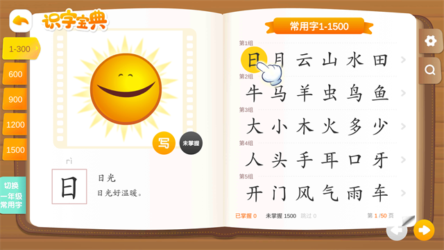 2、包括1200个汉字和5000个词语,识字量覆盖常用书面语的90%;