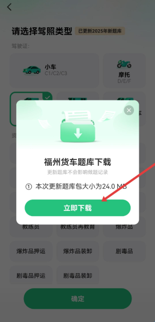 4、系统弹出对应车型的题库下载提示,点击立即下载,完成车型切换及题库更新。