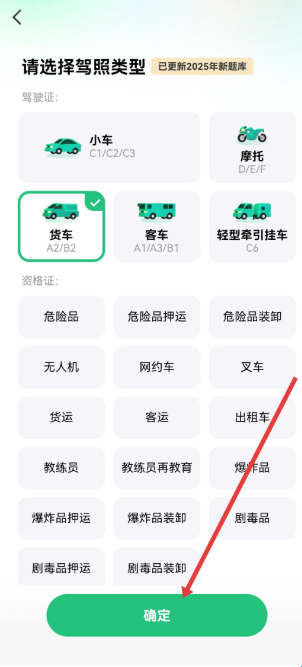 3、在请选择驾照类型页面,选择目标车型,点击底部的确定按钮。