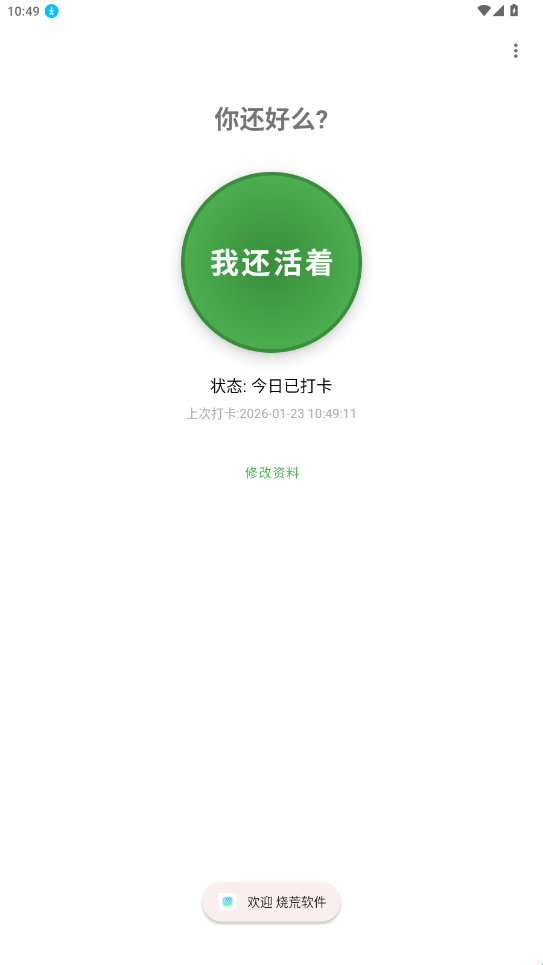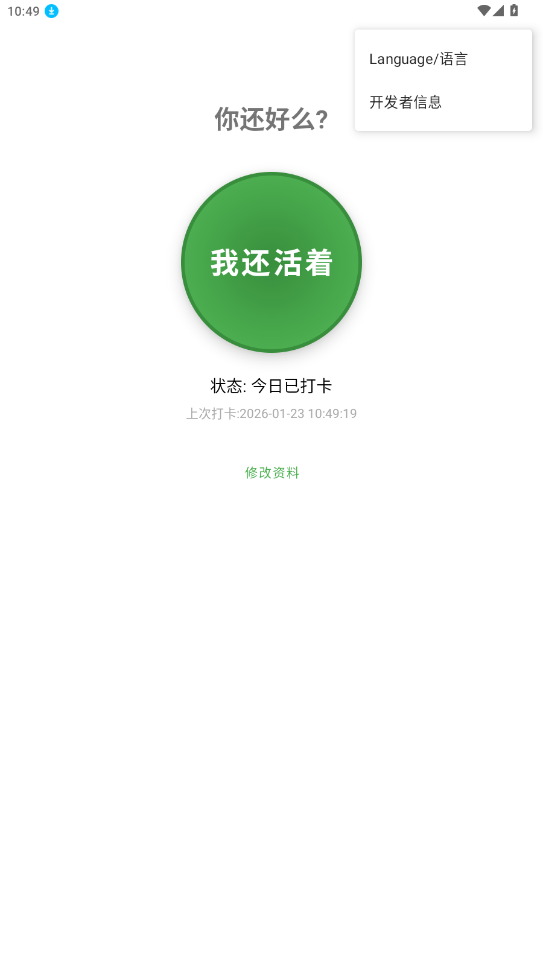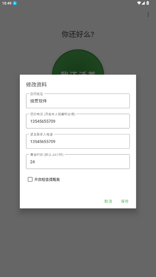 你还好么原名Are You OK?,其核心功能与“死了么”一致,该软件是完全免费的,添加紧急联系人,设置好时间每日准时打卡即可!还可以短信通知喔!时刻守护用户自身安全,是广大独居用户必备app!有需要的可以来下载试试喔!