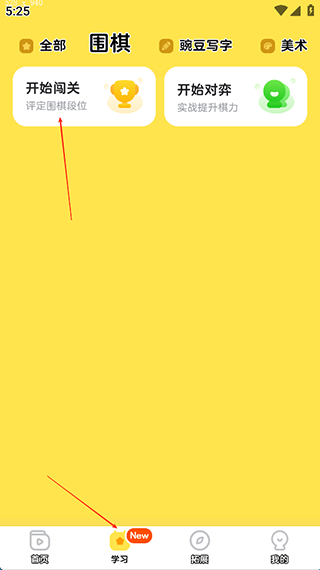 4、点击底部“学习”页签,选择围棋模块开始闯关,按阶段提升策略思维能力。