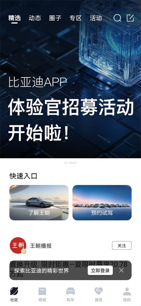 1、在本站下载并安装比亚迪app远程控制,进入首页可以查看比亚迪社区用户的发帖
