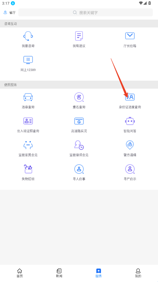 3、我们来到服务板块,点击便民服务中的身份证进度查询