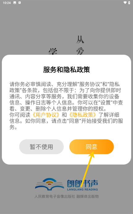 1、在本站下载朗朗书声APP,点击“同意”。