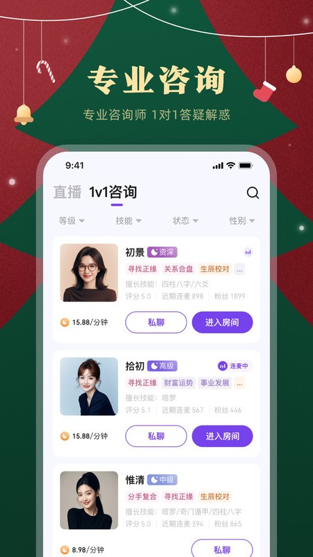 【专业咨询师在线直播】专业心理咨询师精心呈现主题性直播,深入进行案例分析。每日均设免费直播间,您可选择公开连麦或 1V1 匿名连麦,让专业咨询师为您剖析情感问题,给出专业建议;