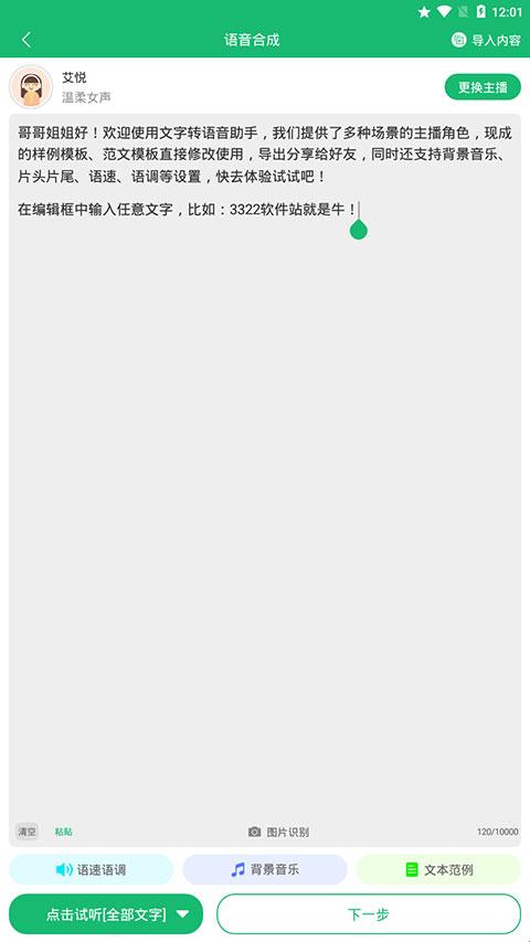 1、智能语音合成:输入文字一键转换为语音。