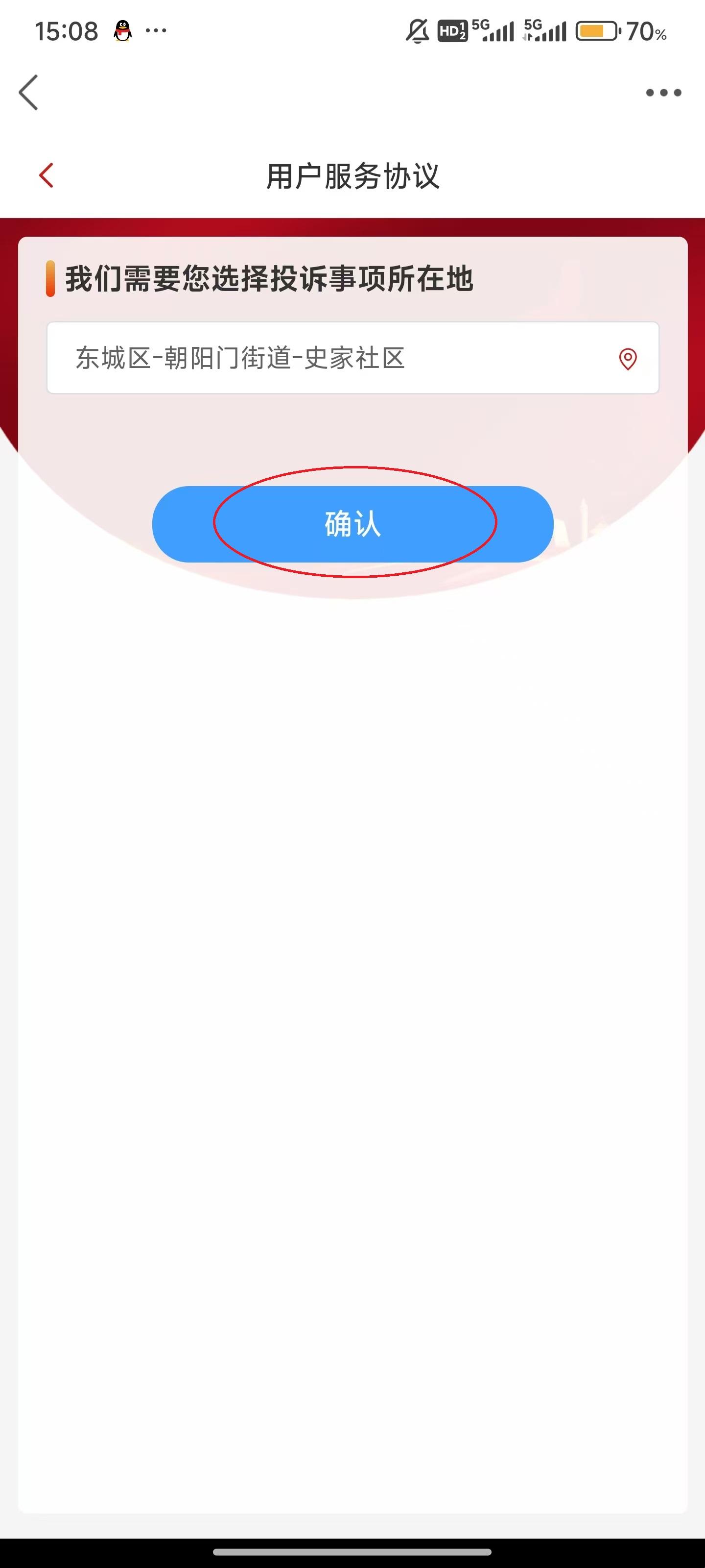 4、选择投诉事项所在地,随后点击“确定”。