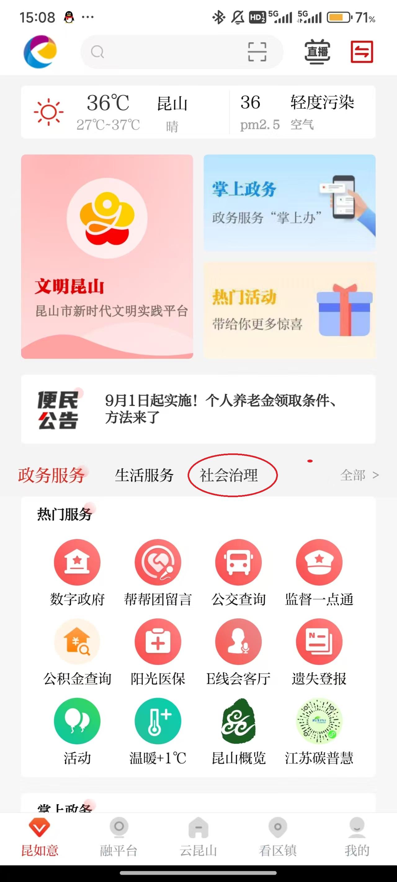1、点击屏幕中间的“社会治理”。