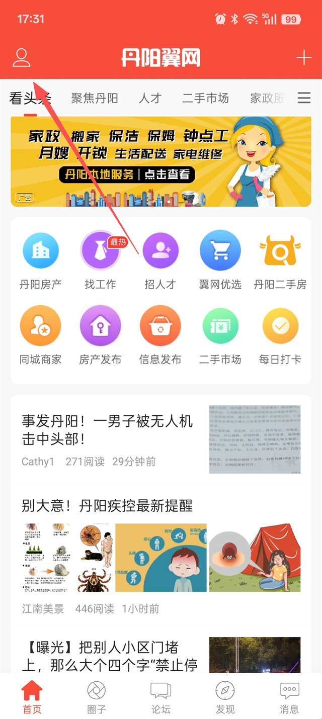 1、打开丹阳翼网App,点击左上角头像