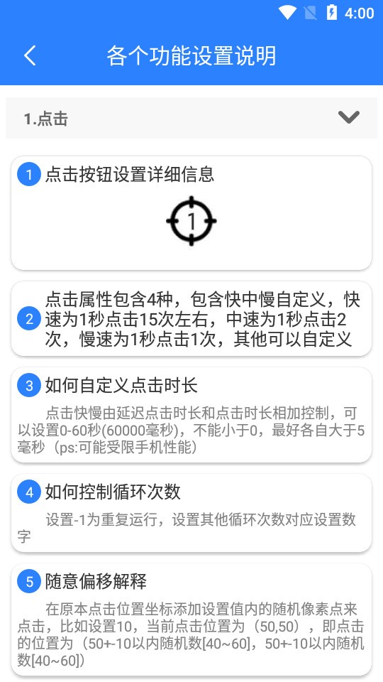2、具备了点击、连点、滑动、长按、双击、自动连点等挂机功能,轻松实现一键启动和关闭;