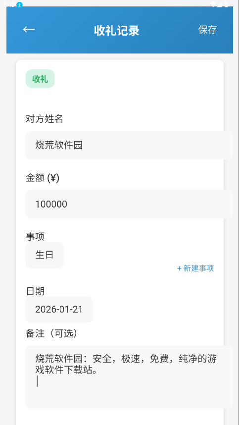 进入后输入相关的姓名,金额及事项,点右上角的保存即可。