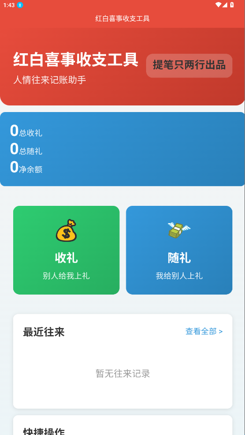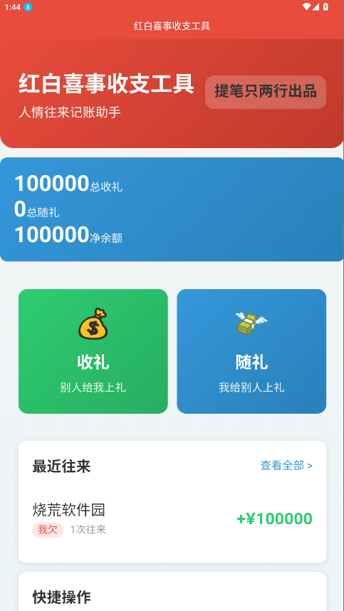 专为红白喜事打造的专业收支工具,电子礼簿系统app是一款让你更加高效管理礼金的应用,可适用各种婚礼,寿宴,满月酒等人情场合,无论是收礼还是送礼都可以计算,可以快速录入姓名,多家及往来事项,方便日后查询,还可以导出数据,超级方便。