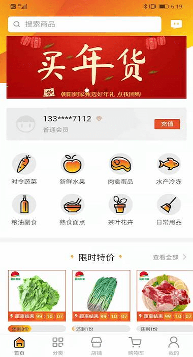 2、进入首页,选择时令蔬菜或新鲜水果等分类浏览商品。