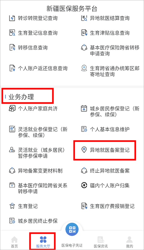 2、切换到服务页面,在业务办理类目下找到“异地就医备案登记”;