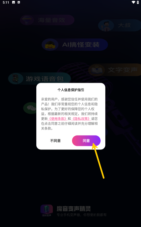 1、在本站下载魔音变声精灵APP,打开后点击“同意”。