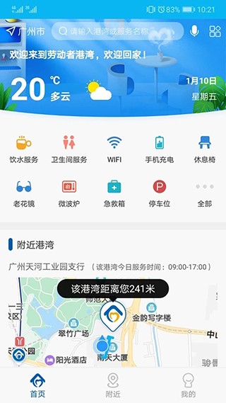 劳动者港湾专为广大劳动工作人员打造,为用户提供饮水、充电、WiFi、厕所、休息椅、停车位等40余项服务,满足户外工作者及特殊群体的多样化需求。用户可随意搜索自己想要的附近生活服务,搜索到之后可快速抵达;软件覆盖全国的服务范围,让用户可以在各种劳累的同时感受到城市爱的温暖。
