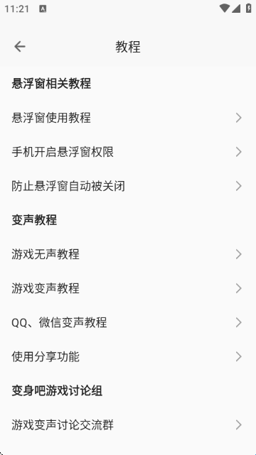 7、学习使用教程:点击底部“教程”按钮,进入帮助中心,可查看“悬浮窗使用教程”“游戏变声教程”“QQ/变声指南”等内容,提升操作熟练度。