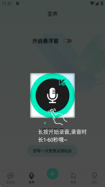 6、录制并使用变声效果:长按麦克风图标开始录音(支持1-60秒),录制完成后即可体验变声效果,适合用于聊天、直播或游戏语音。
