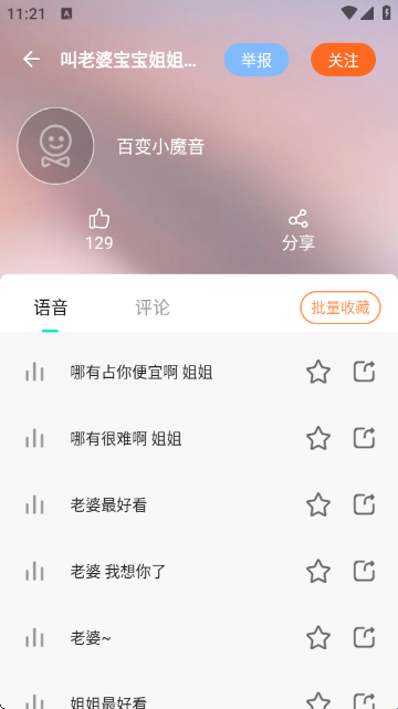 3、查看具体语音包内容:点击任意语音包(如“叫老婆宝宝姐姐…”),进入详情页,可播放语音、点赞、分享或收藏,并在评论区互动。