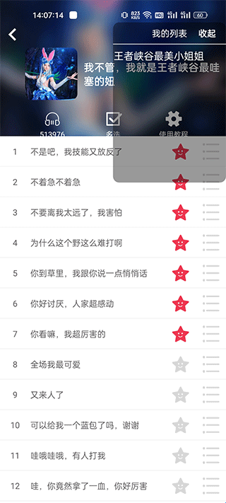 5、点开添加过的语音包,就能看见各种语音,在游戏中只需要将语音功能打开,选择一条语音播放就会出现相对应的话语。