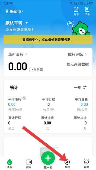 1、界面显示车辆油耗相关数据,如最新油耗等统计项,底部发现按钮可探索更多功能,在此页面车主可备份数据,还能查看能耗评级等信息,掌握车辆油耗动态。