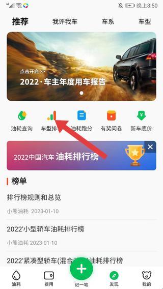 2、首页顶部有推荐等栏目车主年度用车报告等卡片,设有油耗查询等功能入口,还有中国汽车油耗排行榜,方便用户了解油耗相关信息。